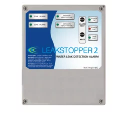 Water Leak Detection, sensor based, 2 zone alarm panel. The outputs and method of how it detects water are pretty much the same as with the single zone descriptions given above. The LeakStopper detects water leaks and instantly triggers an alarm to warn you. It is capable of monitoring 2 areas simultaneously. If more than one of these areas has a leak, the LeakStopper can show this. Each zone on the alarm panel can be connected to a water detection sensor. This can be a sensor tape, a probe or a pad. Should water touch any of these, it will signal the panel and set it into alarm. Using a multizone panel allows a number of different areas or a large area to be defined into zones. Should a leak occur in any of these, the LeakSaver will indicate where it is.
