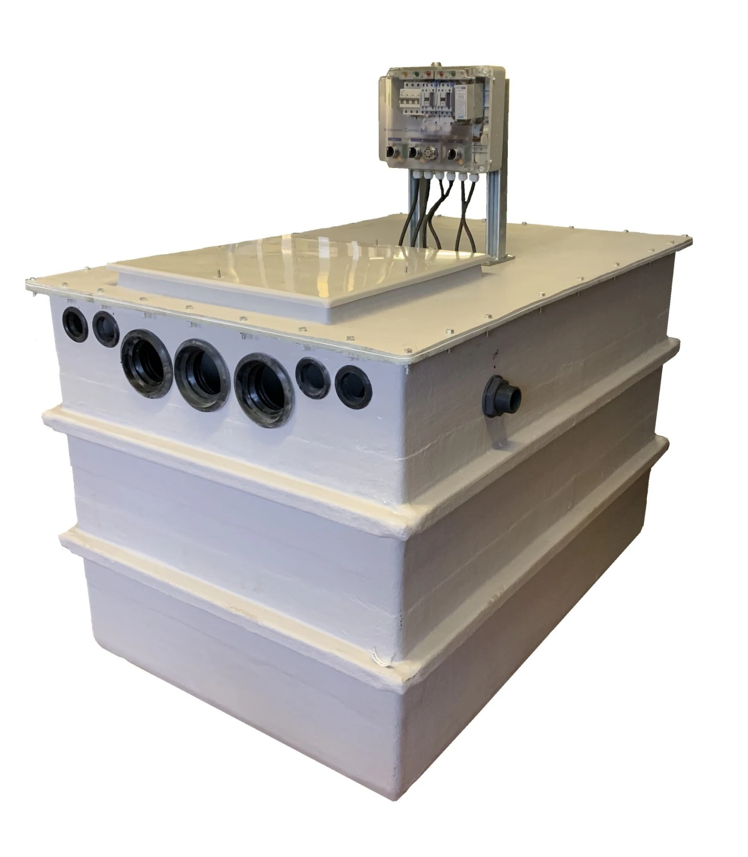The 125 Litre Above ground GRP (glass reinforced plastic) Sewage pumping station can pump up to 100m across to mains.