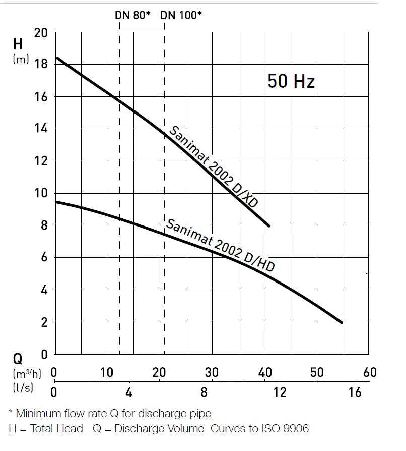 - Discharge flange DN 80, plus flanged socket with 4″ sleeve and clips (for discharge pipe DN 80 / 100).