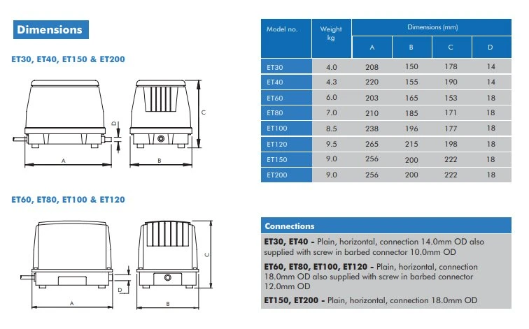 Designed for use in sewage aeration applications, the Charles Austen ET Enviro air pump range is situated outside the sewage treatment for aeration of waste water in the first stage of treatment. Other applications include aeration for Koi ponds and spa’s/whirlpools, rainwater harvesters, cellar emptying, swimming pool emptying, flood prevention and fuel cell manufacture.