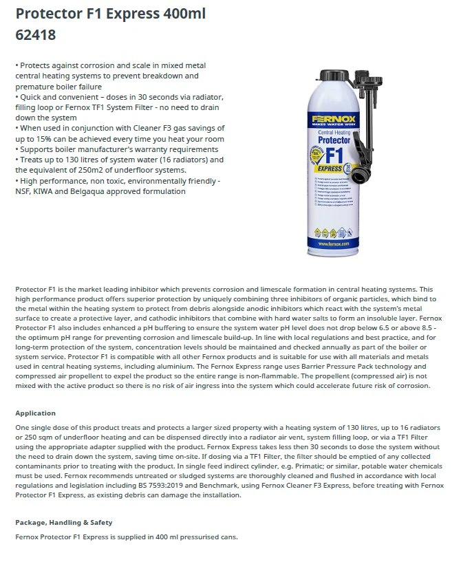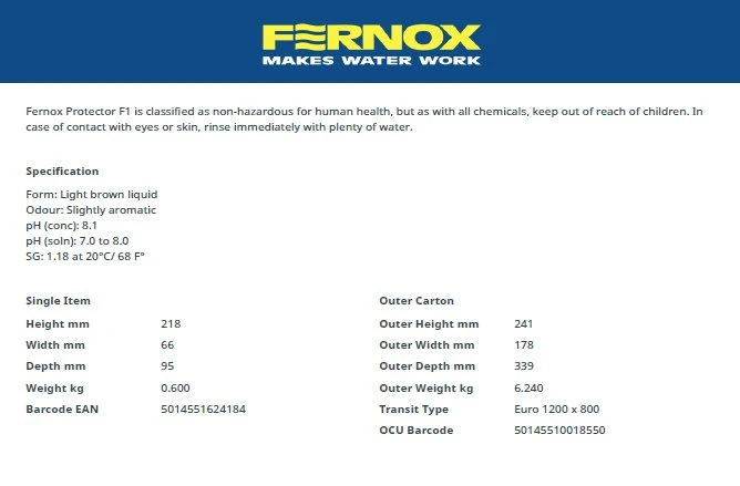 Fernox Protector F1 is classified as non-hazardous for human health, but as with all chemicals, keep out of reach of children. In case of contact with eyes or skin, rinse immediately with plenty of water.