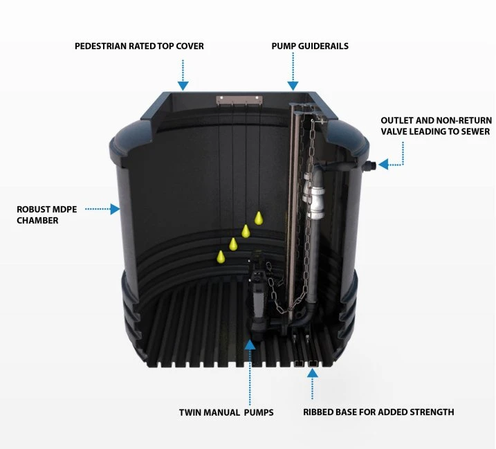 Twin Rigged -Package Sewage Pumping Station. A packaged pump station is used when gravity drainage on site cannot be achieved. The waste from the site flows into an underground storage chamber, where it is then pumped to the main sewer. Packaged pump stations can be used for both foul water (sewage) and surface water applications. Our packaged pump station systems are designed to have a 24-hour storage capacity and are manufactured to BSEN752-6 standards. The Twin Rigged 800/1200/1700 Pump Station is suitable for a domestic sewage pumping station for use in areas where gravity flow is not available. It can be used for various drainage applications, with the system also used for the transfer of sewage or waste water, all specially designed for easy installation. The Twin Rigged 800/1200/1700 is a compact sewage pump station suitable for small to large houses and also commercial applications. The Twin Rigged 800/1200/1700 is particularly suitable when water or sewage is collected lower than the main sewer or a septic tank system.
